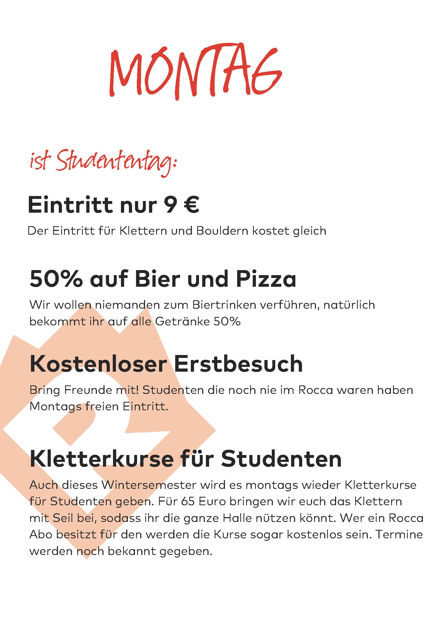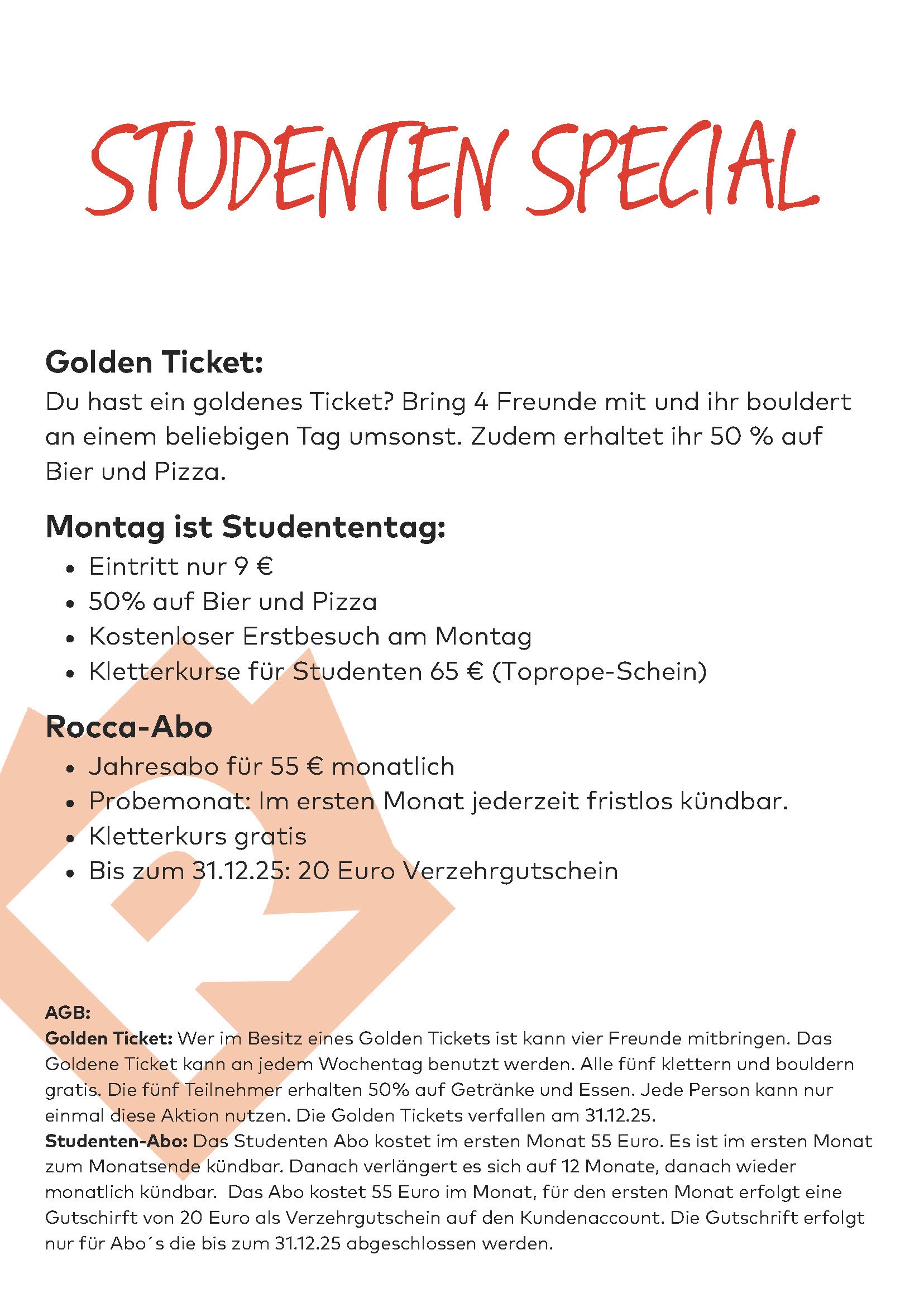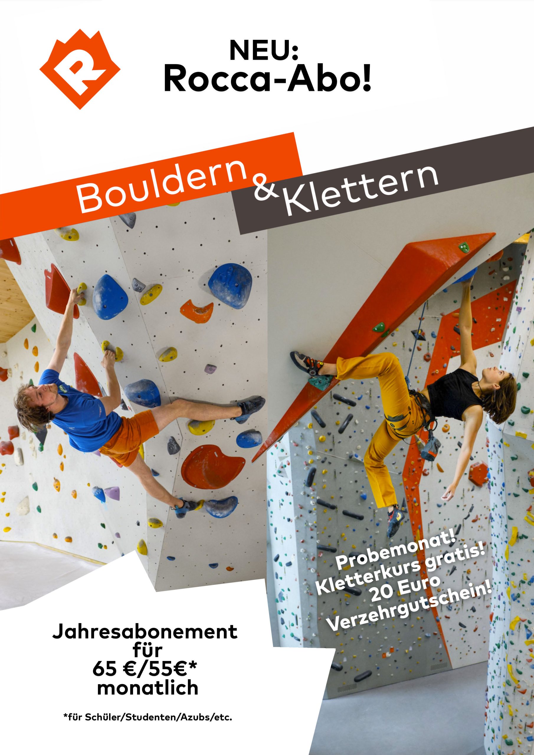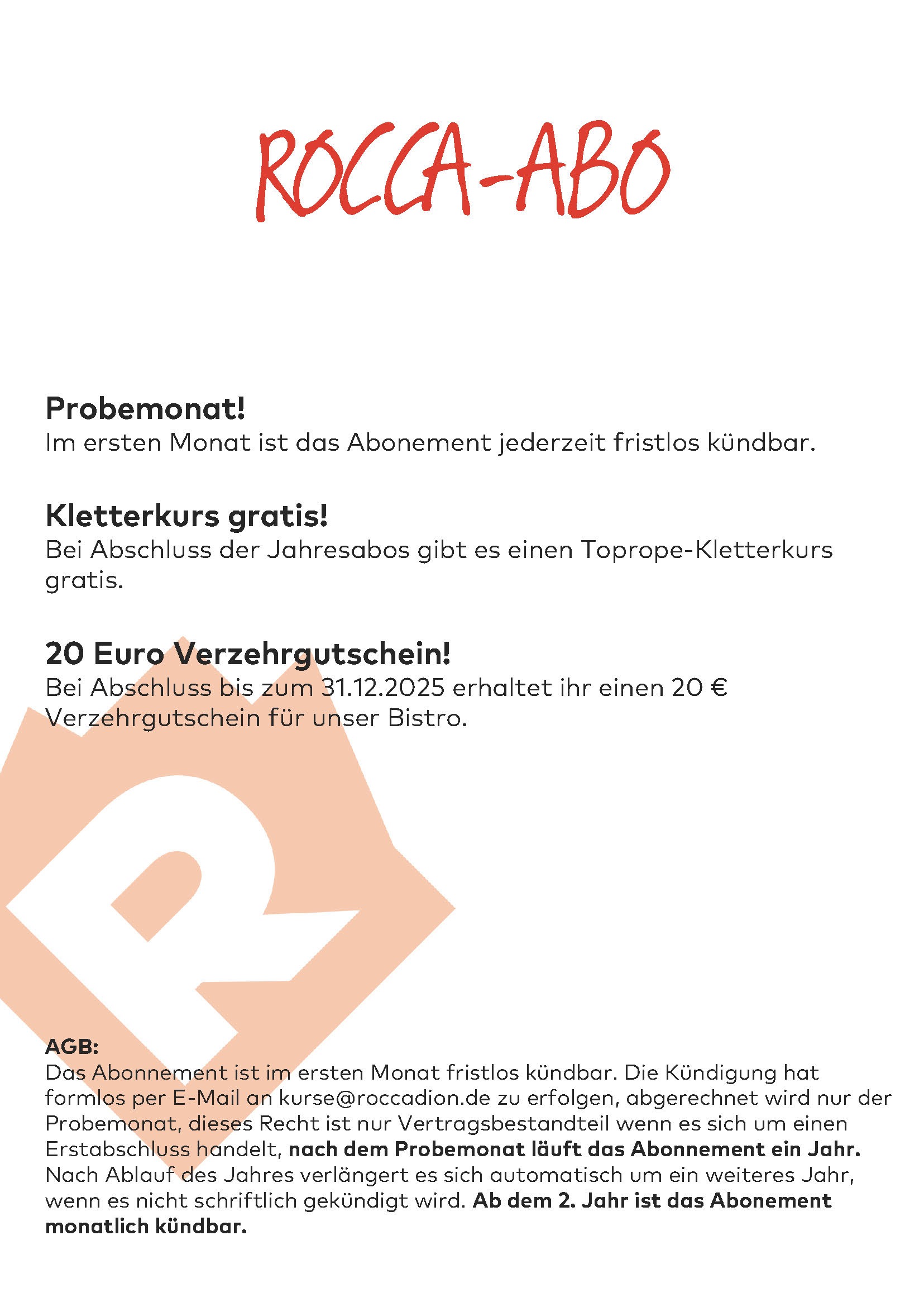 ** Das Rocca Abo gilt für den Bereich Klettern und Bouldern. Es wird monatlich abgerechnet und kann in den ersten vier Wochen nach Erstabschluß fristlos gekündigt werden. Danach verlängert sich das Abo automatisch um weitere 11 Monate. Im Folgejahr ist eine Kündigung monatlich möglich.